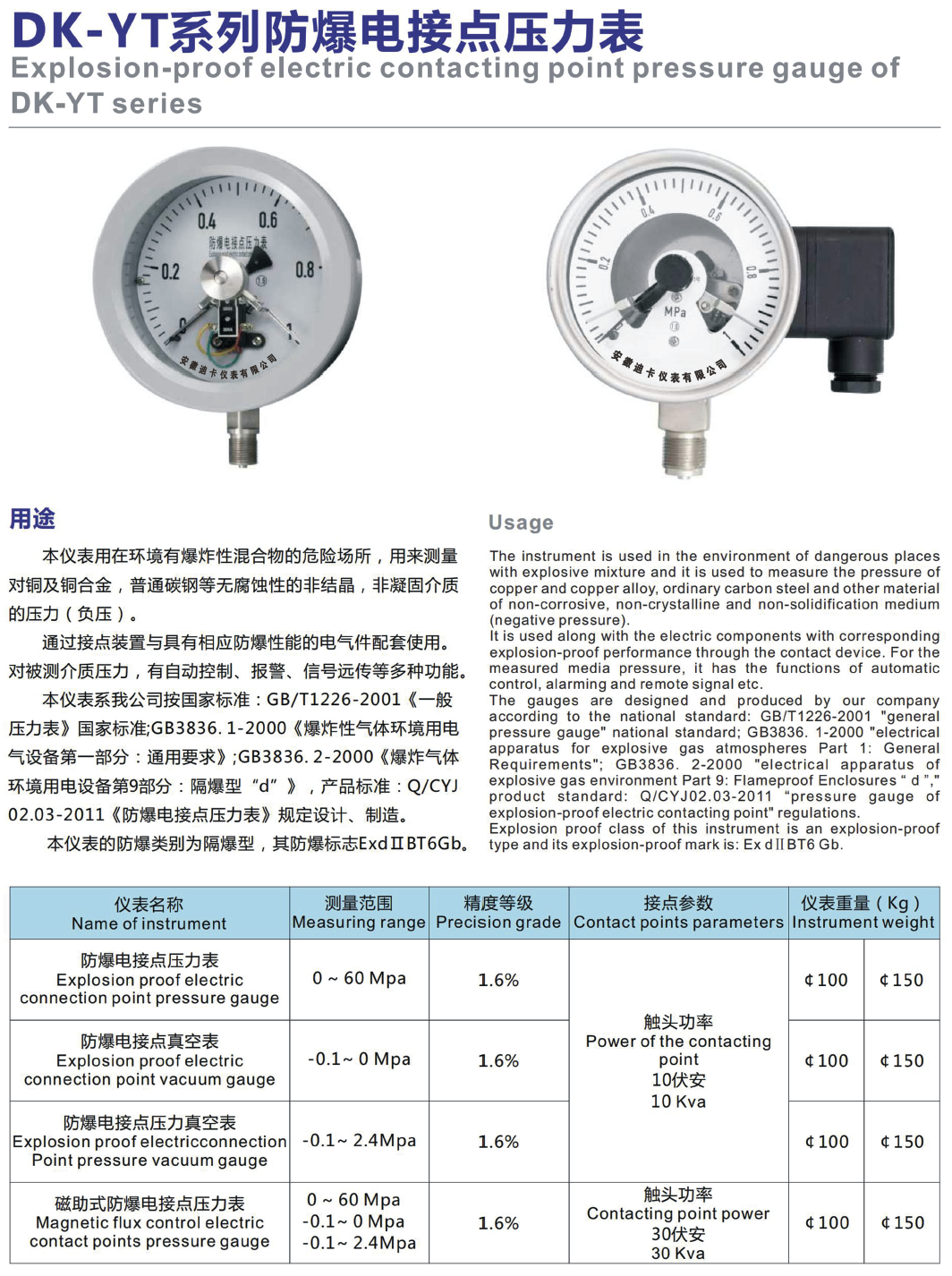 產(chǎn)品名稱:DK-YT系列防爆電接點壓力表